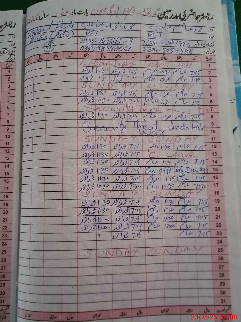 | CNIC | Full Name | Designation | R/C | Absence During Last Calender Month |