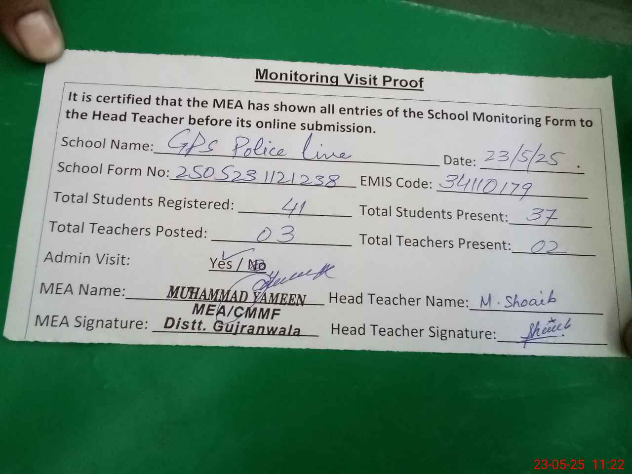 | Attendance Register | Head Teacher | MEA with School | Visit Proof |