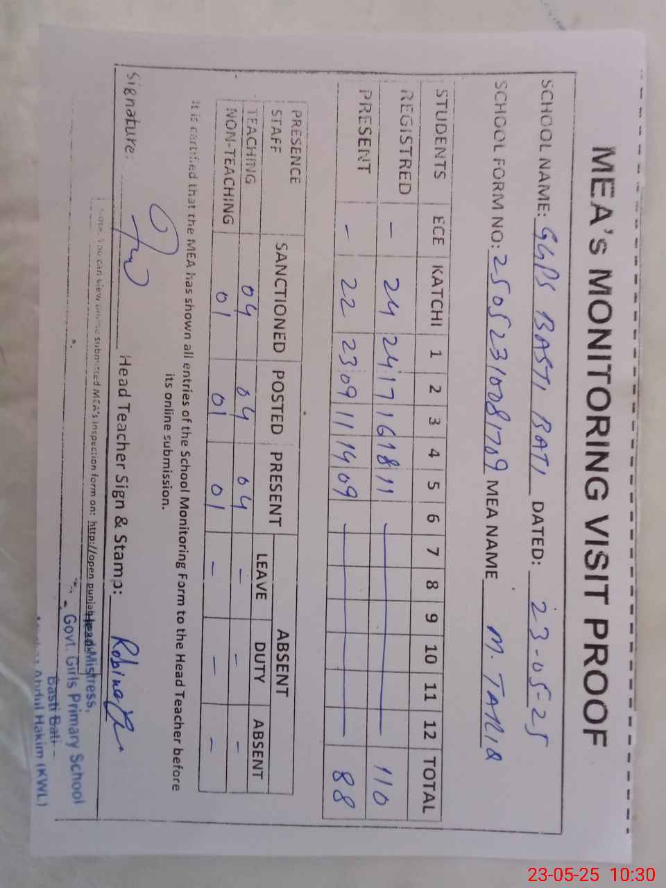 | Attendance Register | Head Teacher | MEA with School | Visit Proof |