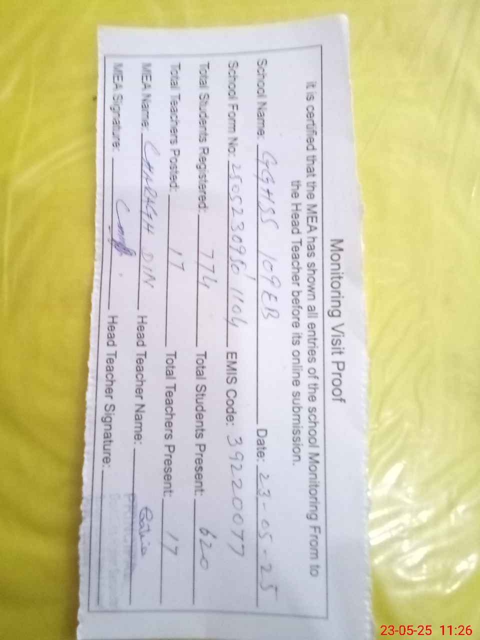 | Attendance Register | Head Teacher | MEA with School | Visit Proof |