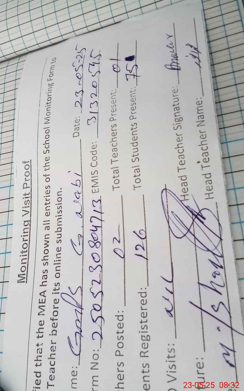 | Attendance Register | Head Teacher | MEA with School | Visit Proof |