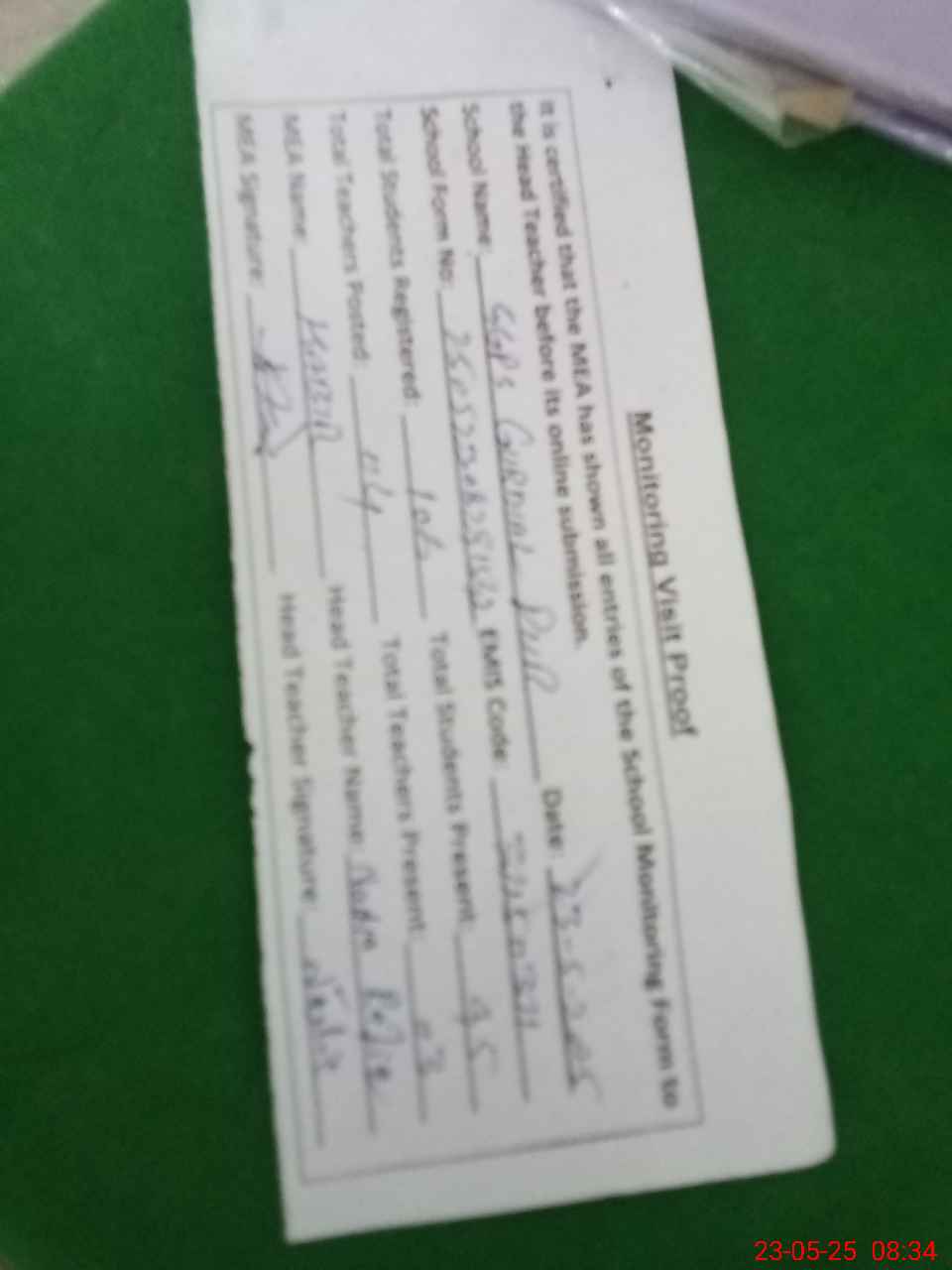 | Attendance Register | Head Teacher | MEA with School | Visit Proof |