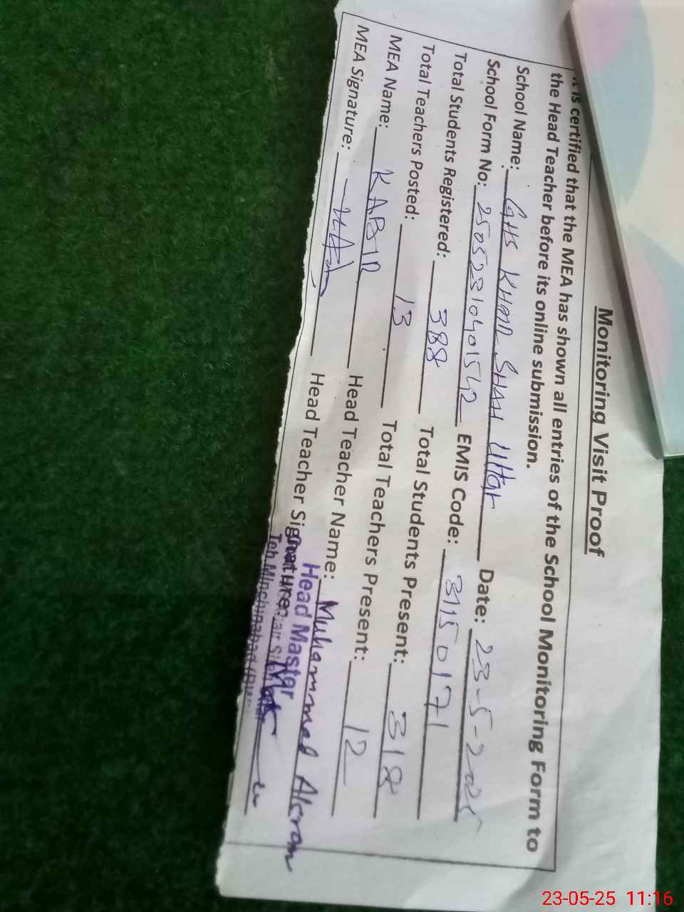 | Attendance Register | Head Teacher | MEA with School | Visit Proof |