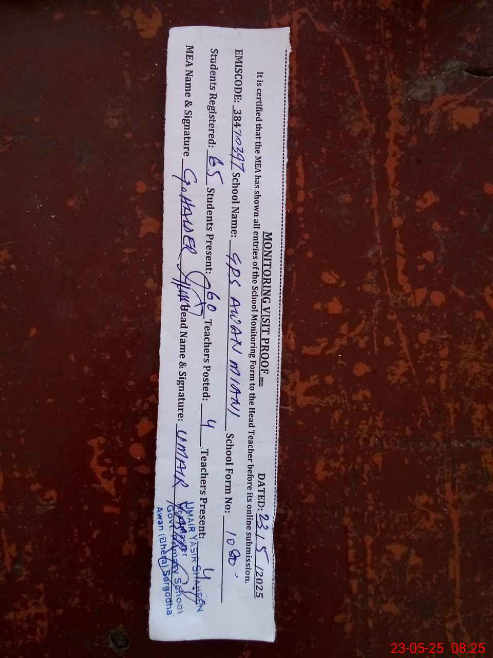 | Attendance Register | Head Teacher | MEA with School | Visit Proof |