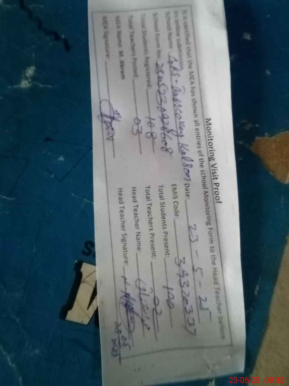 | Attendance Register | Head Teacher | MEA with School | Visit Proof |