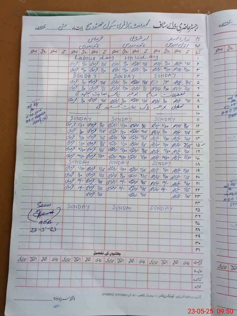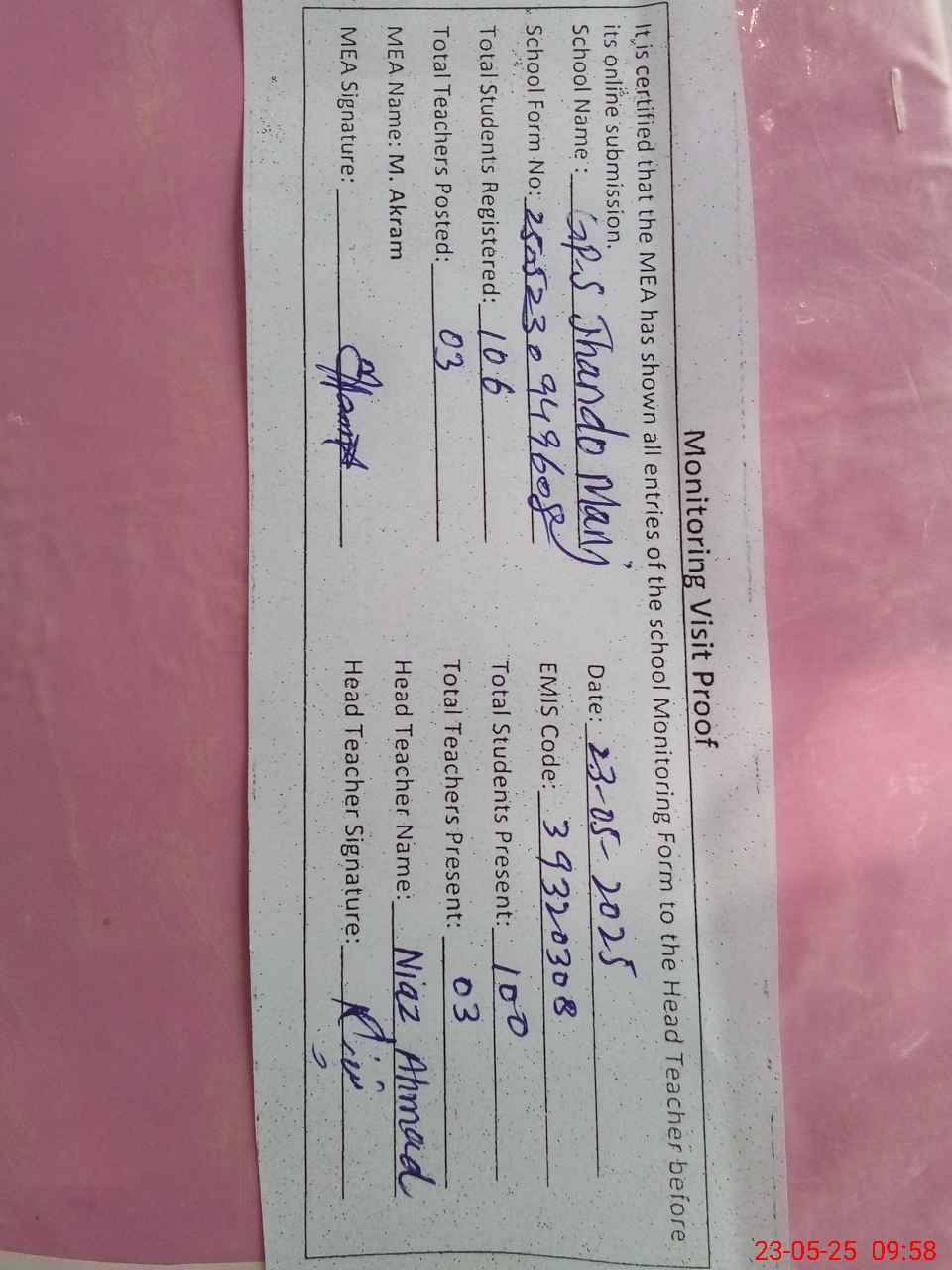| Attendance Register | Head Teacher | MEA with School | Visit Proof |