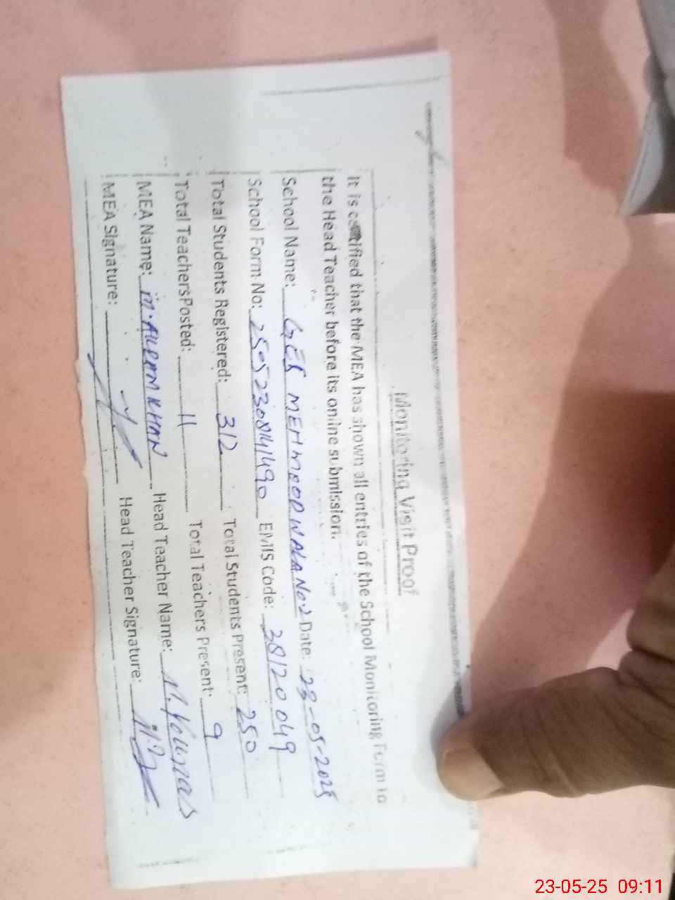 | Attendance Register | Head Teacher | MEA with School | Visit Proof |