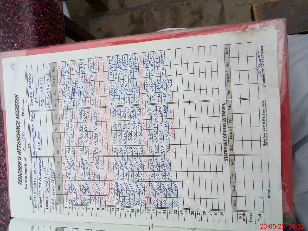 | Name: Mu**** Yo**** Designation: (School Headmaster's/Headmistress's) HEADMASTER Phone/Cell Number: 03**** |