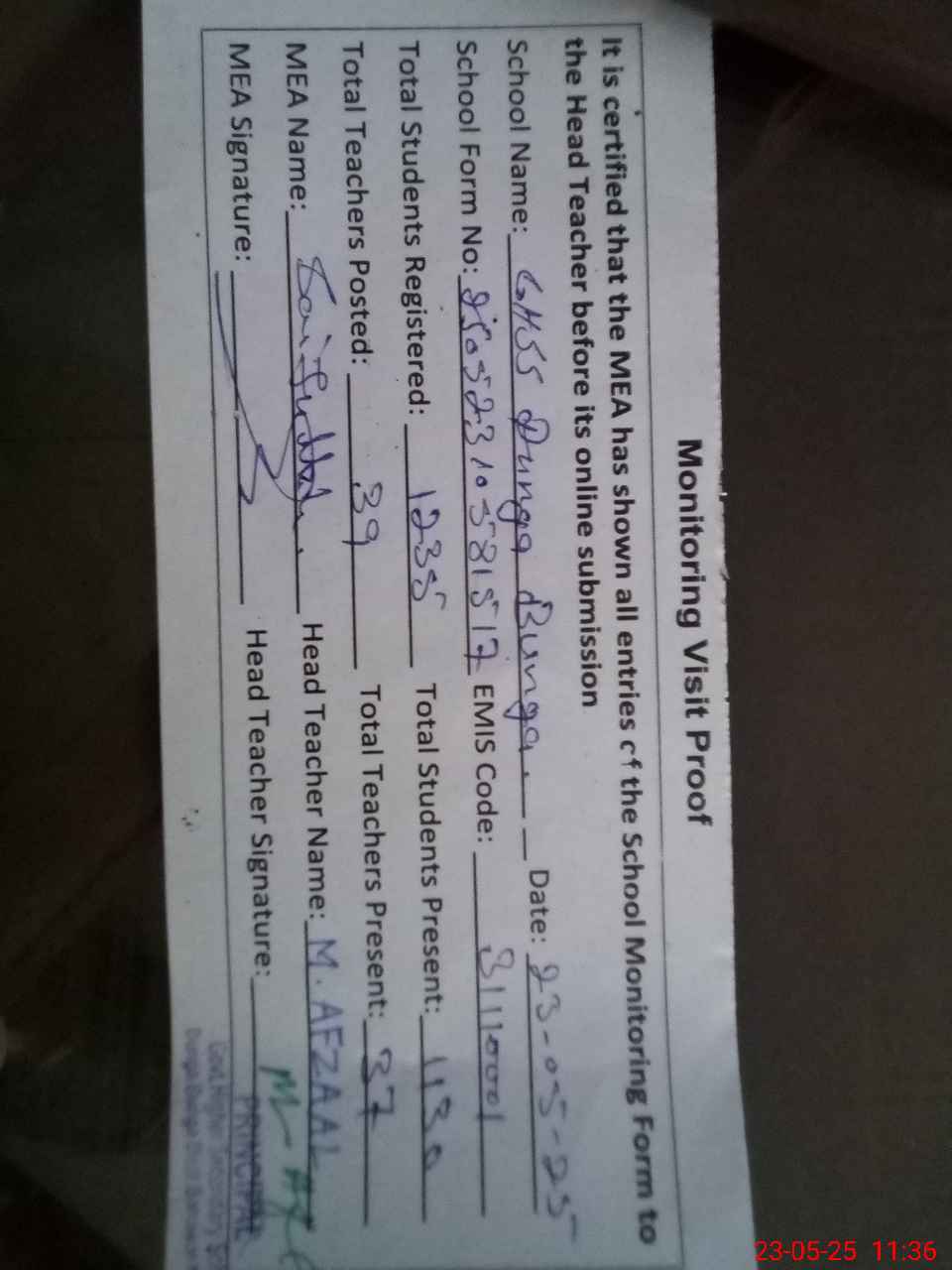 | Attendance Register | Head Teacher | MEA with School | Visit Proof |