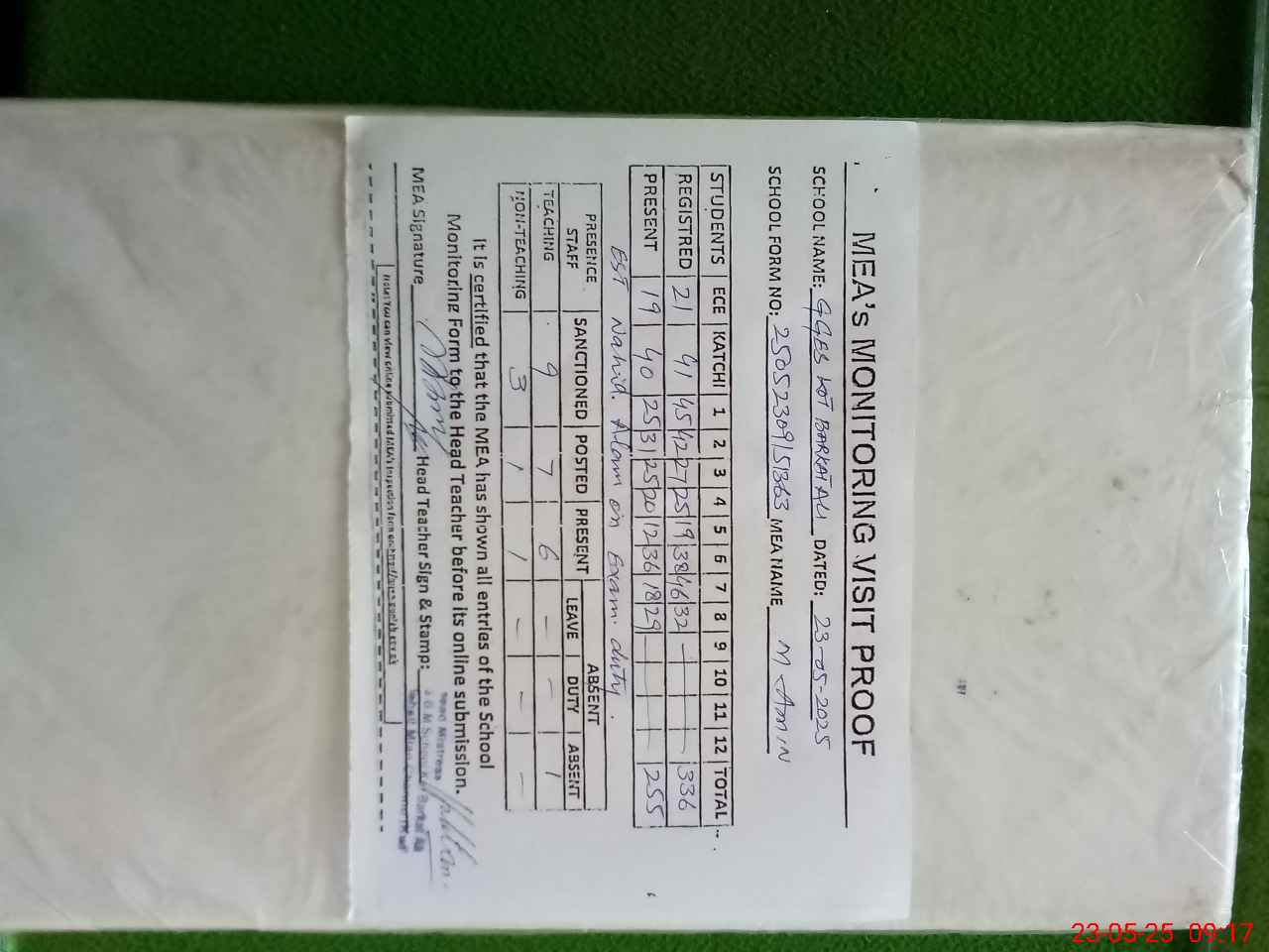 | Attendance Register | Head Teacher | MEA with School | Visit Proof |