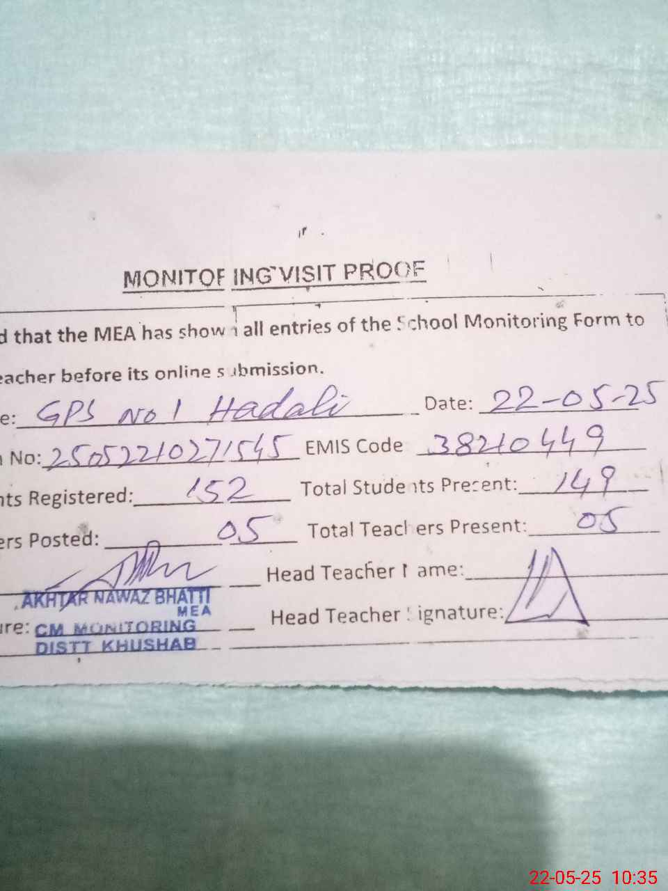 | Certified that this School was Inspected by the Undersigned MEA/DMO Today and the Information Stated Above is as Per Record. | |||||