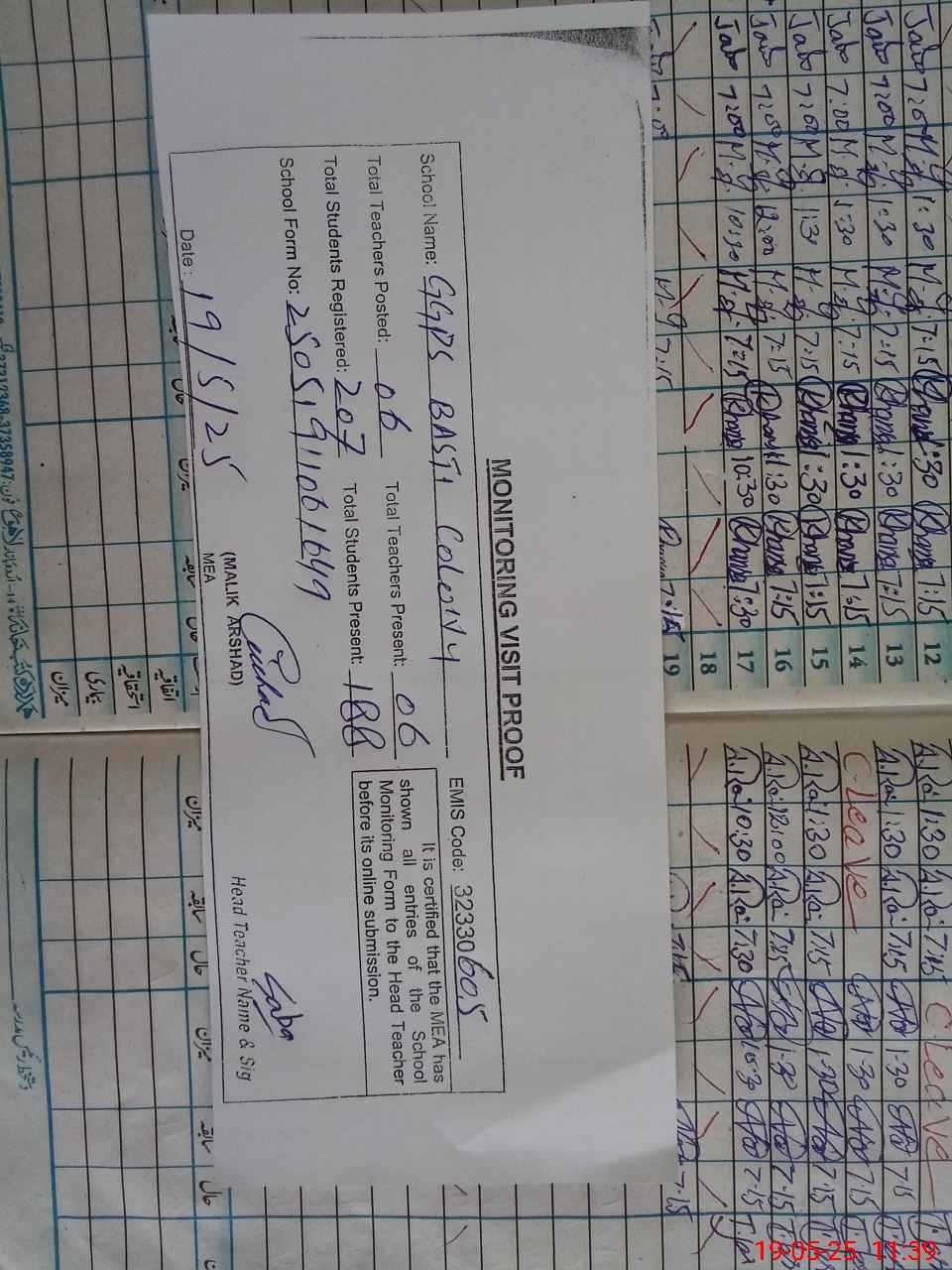 | Attendance Register | Head Teacher | MEA with School | Visit Proof |