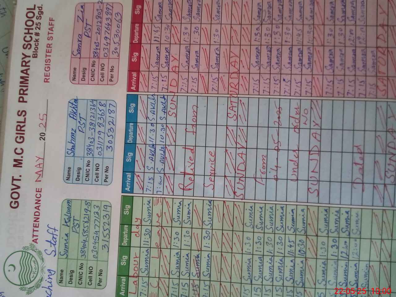 | CNIC | Full Name | Designation | R/C | Absence during last cal. month |