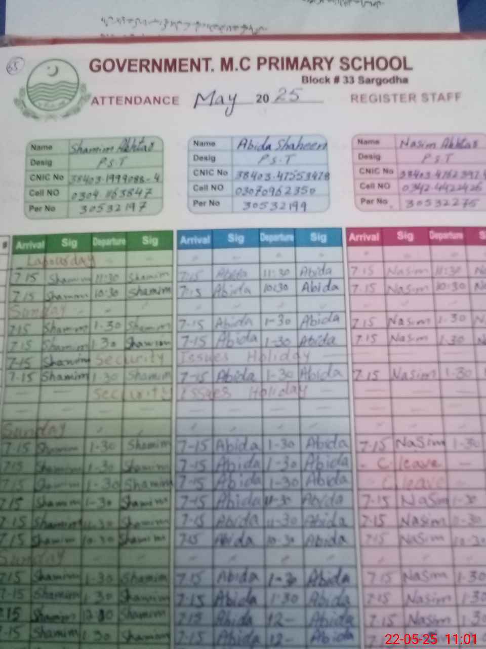 | CNIC | Full Name | Designation | R/C | Absence During Last Calender Month |