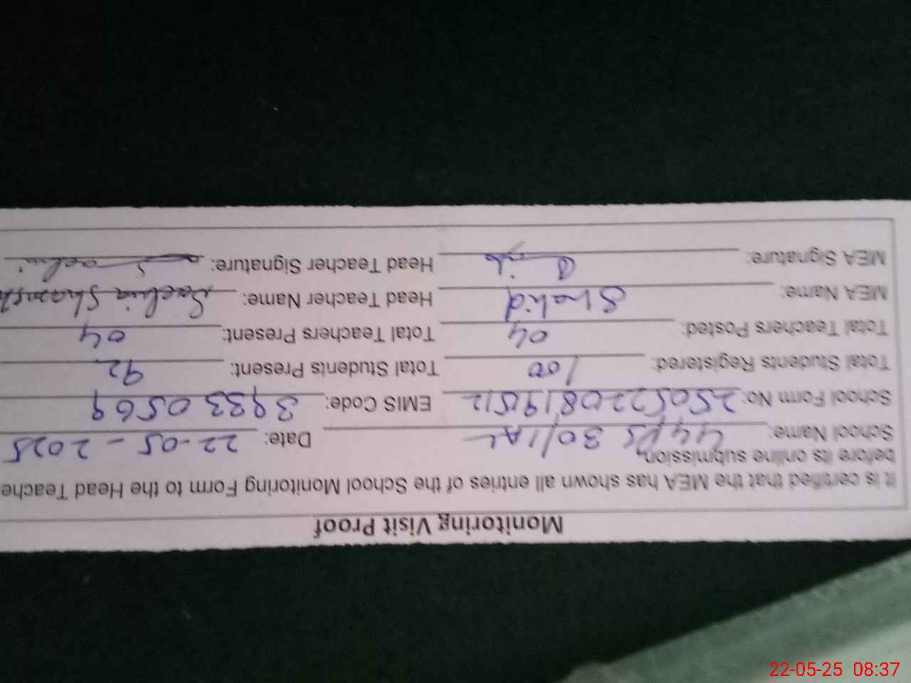 | Certified that this School was Inspected by the Undersigned MEA/DMO Today and the Information Stated Above is as Per Record. | |||||