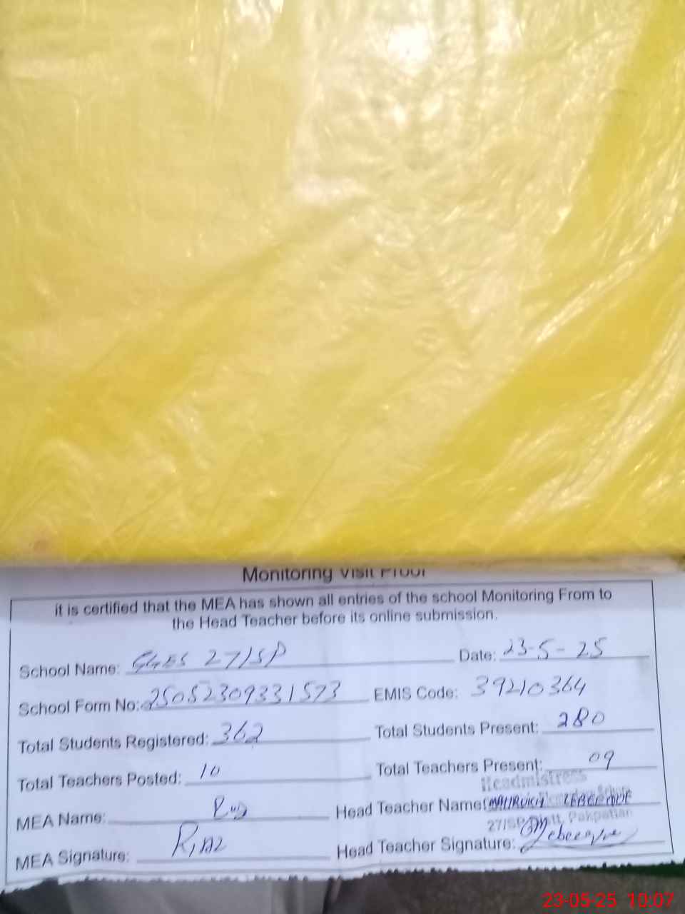 | Attendance Register | Head Teacher | MEA with School | Visit Proof |