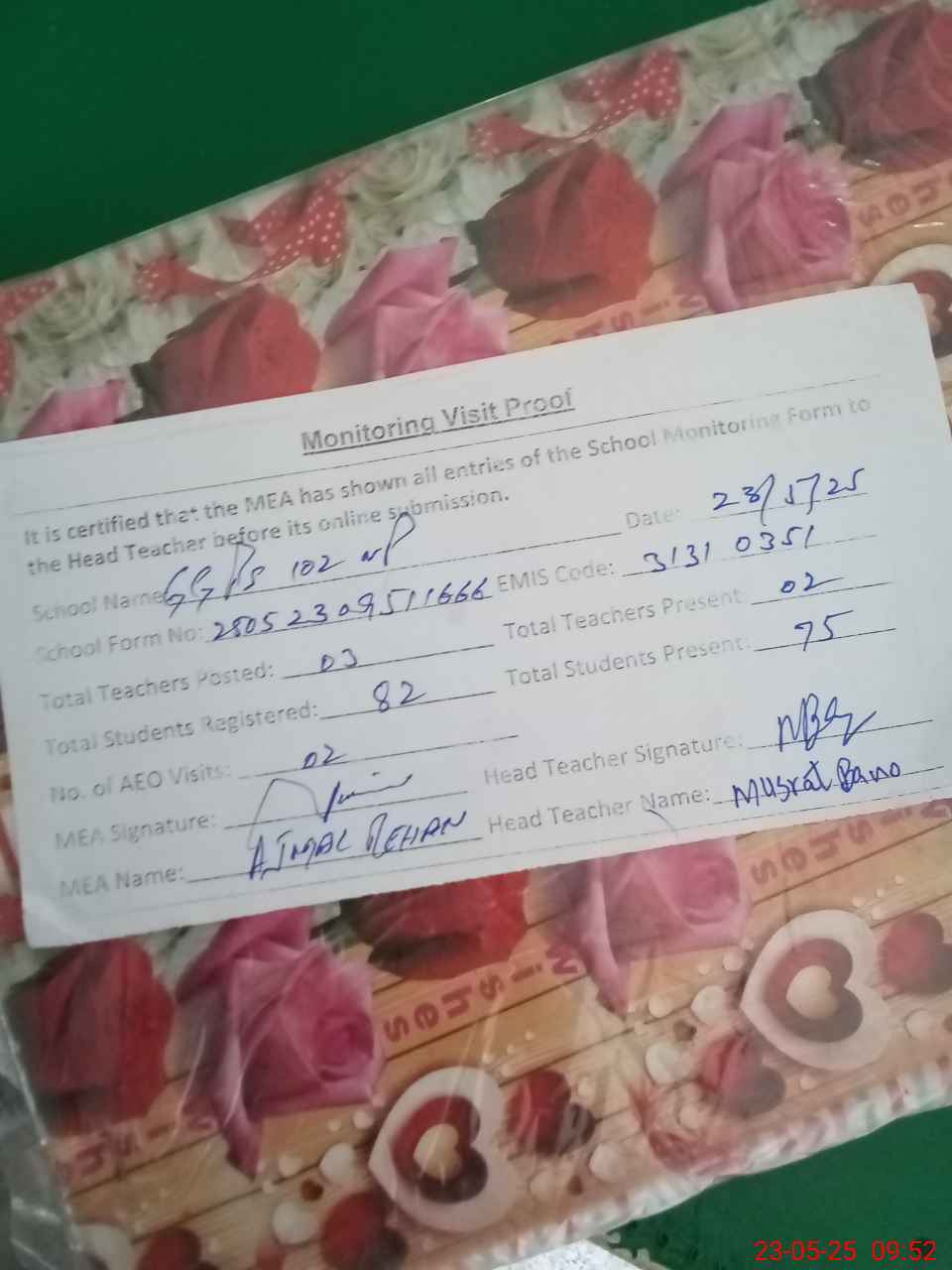 | Attendance Register | Head Teacher | MEA with School | Visit Proof |