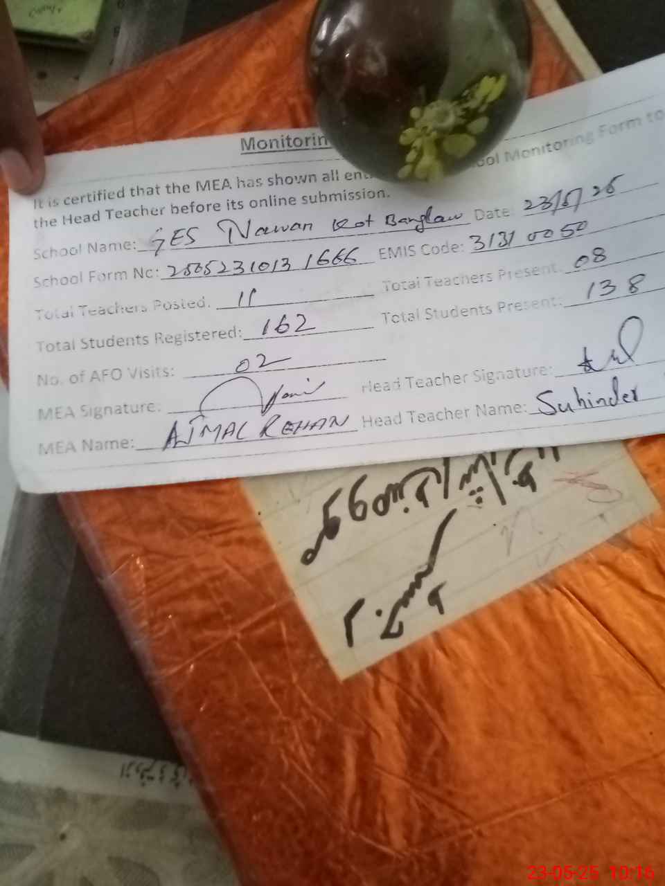 | Attendance Register | Head Teacher | MEA with School | Visit Proof |