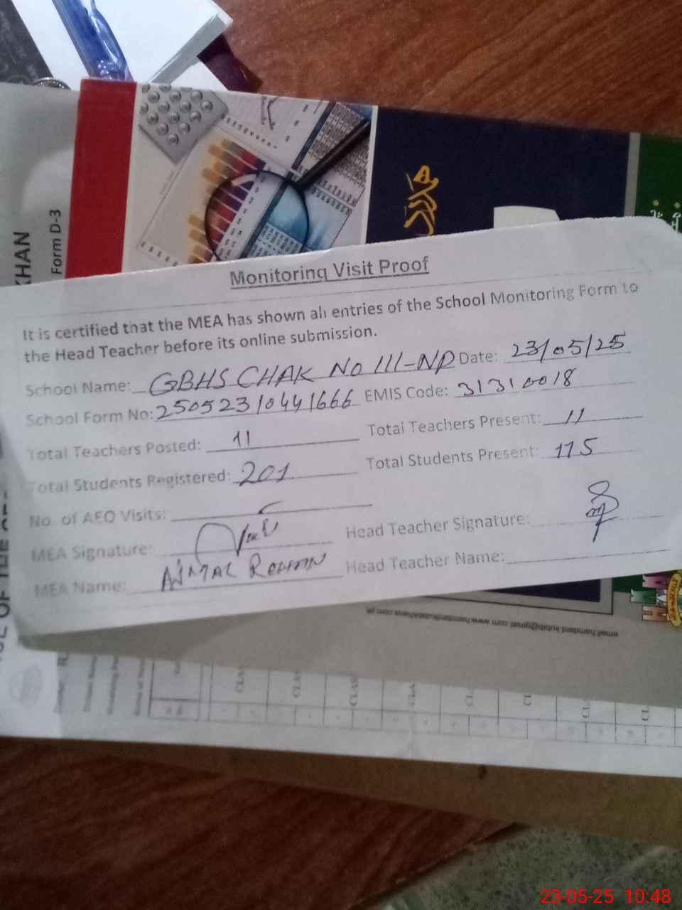 | EMIS Code: 31310018 | Name of School: GHS CHAK 111 NP | |||