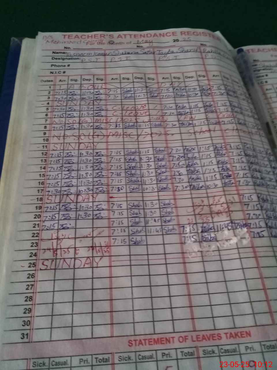 | CNIC | Full Name | Designation | R/C | Absence During Last Calender Month |