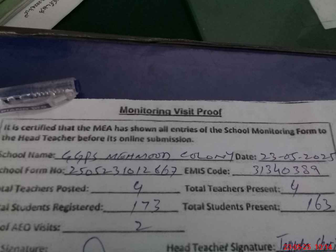 | Attendance Register | Head Teacher | MEA with School | Visit Proof |