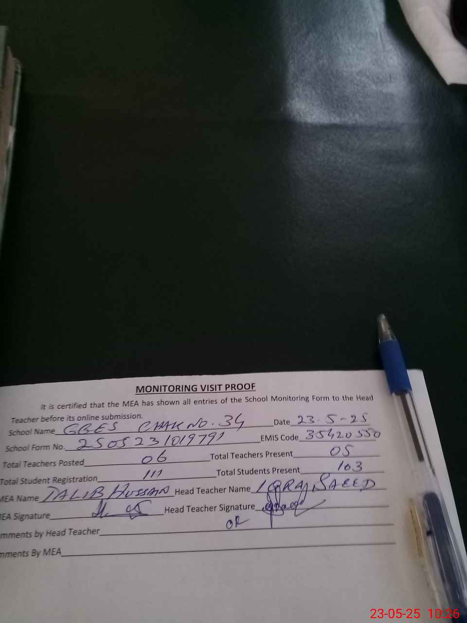 | Attendance Register | Head Teacher | MEA with School | Visit Proof |