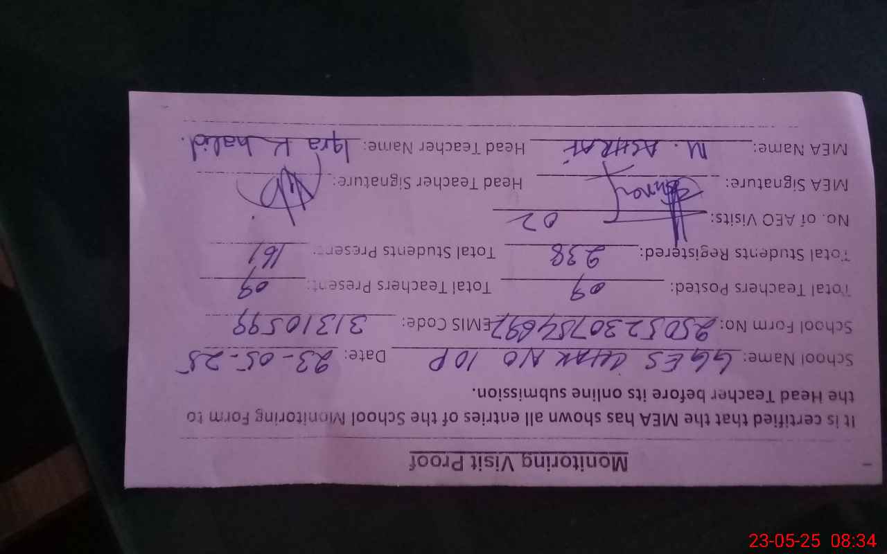 | Attendance Register | Head Teacher | MEA with School | Visit Proof |