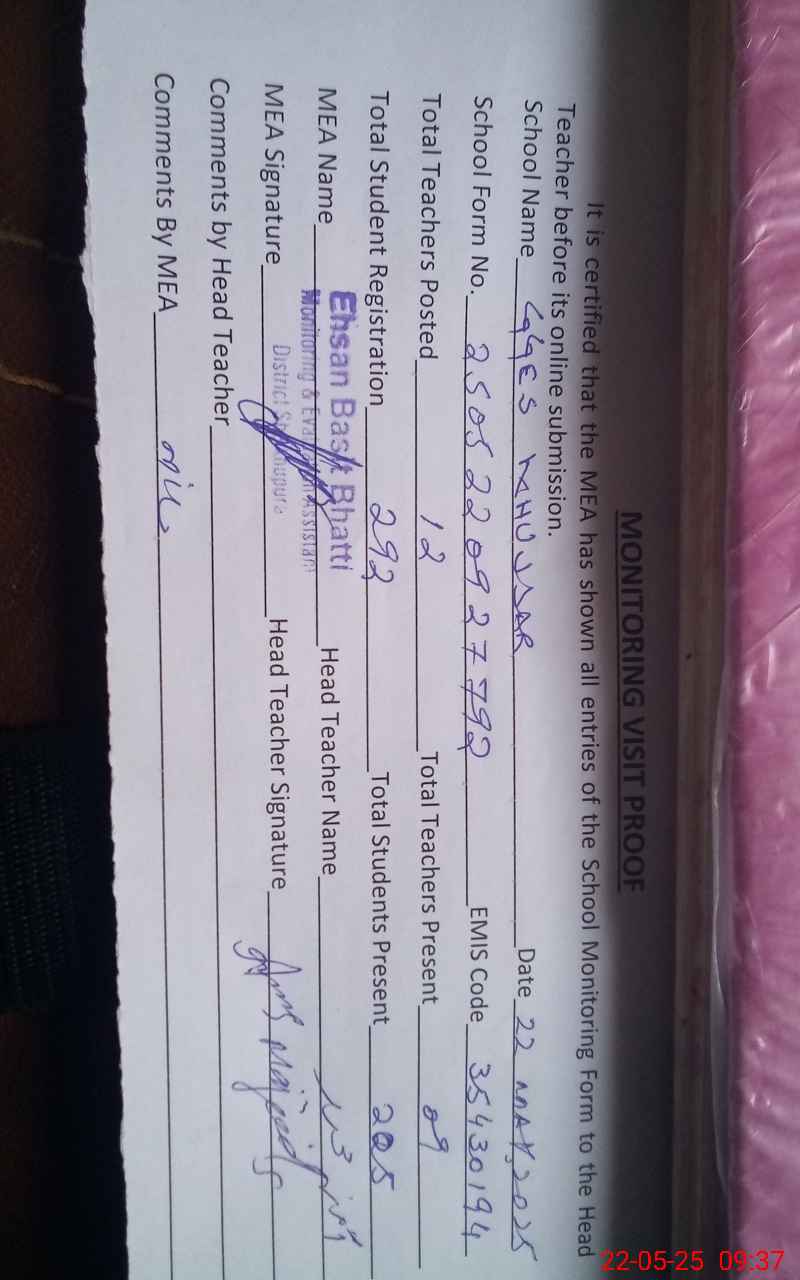 | Attendance Register | Head Teacher | MEA with School | Visit Proof |