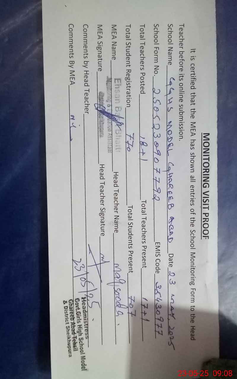 | Attendance Register | Head Teacher | MEA with School | Visit Proof |