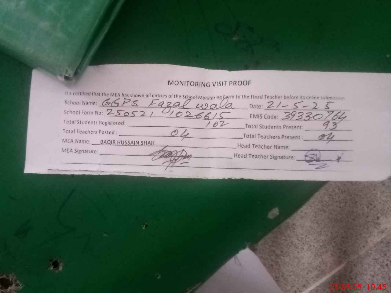 | Attendance Register | Head Teacher | MEA with School | Visit Proof |