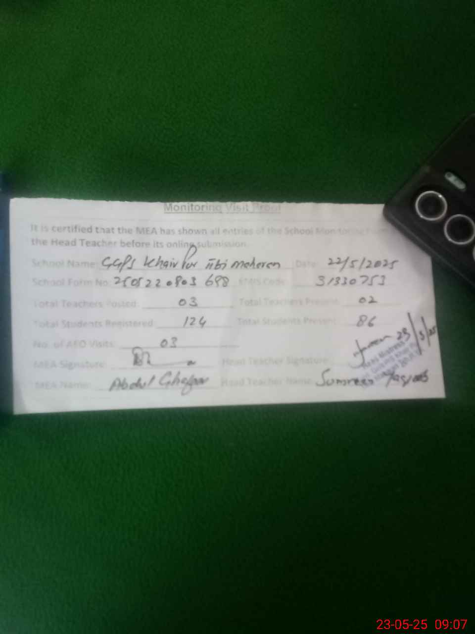 | Attendance Register | Head Teacher | MEA with School | Visit Proof |
