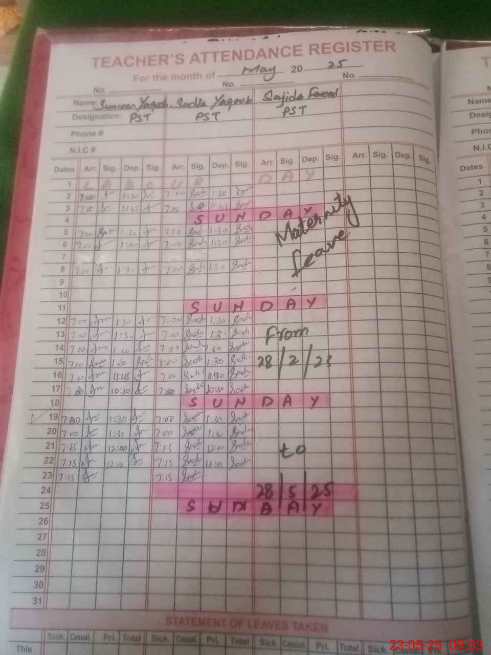 | 31**** | Sa**** Fa**** | 1 | 1 | 0 | 0 | 0 | 0 | 0 | 0 | 0 | 0 | 0 | Maternity |
