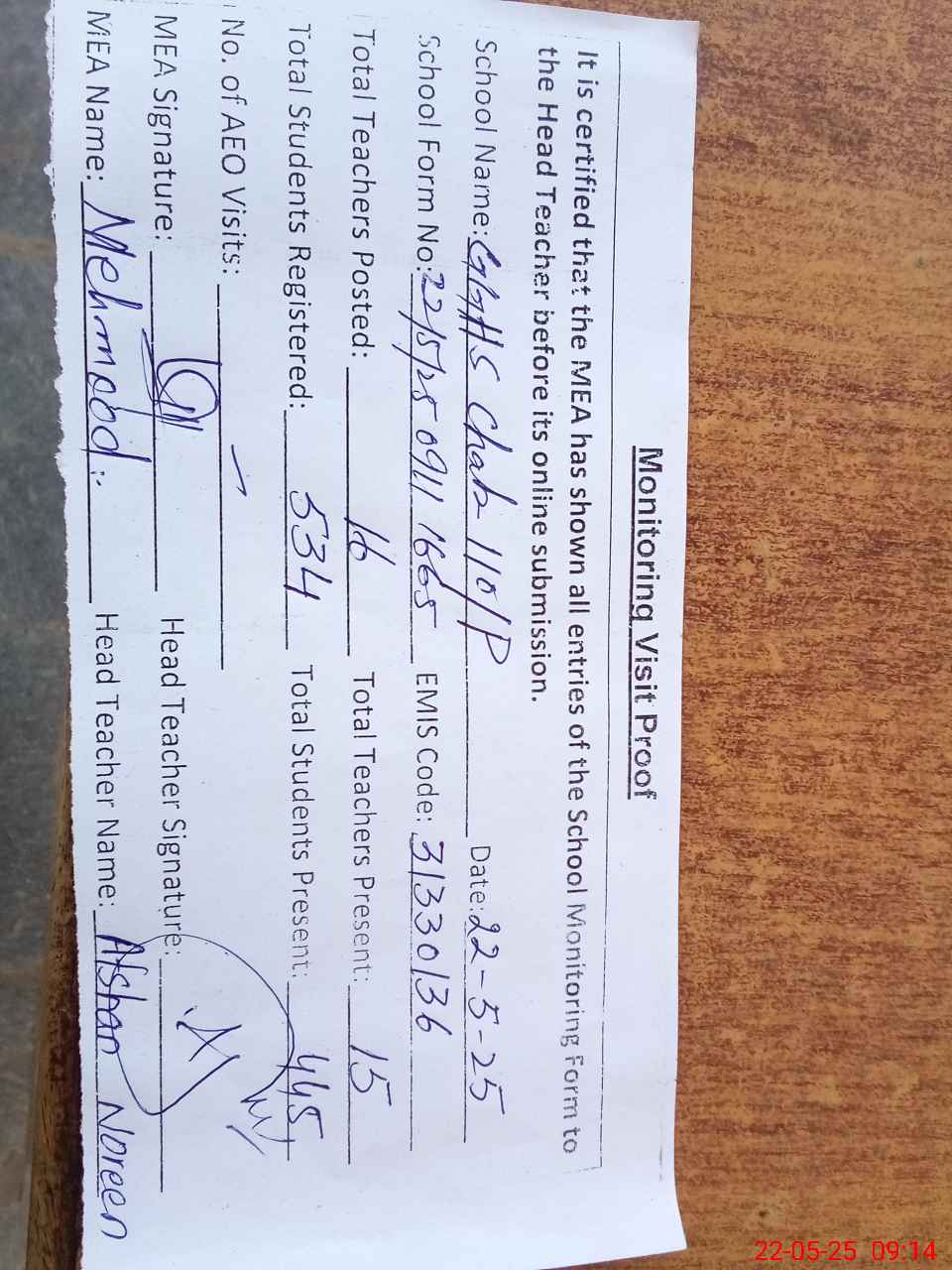| Attendance Register | Head Teacher | MEA with School | Visit Proof |