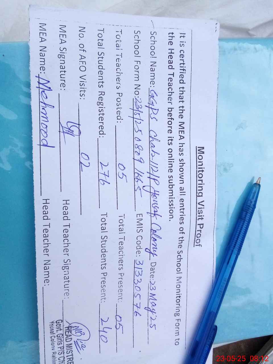 | Attendance Register | Head Teacher | MEA with School | Visit Proof |