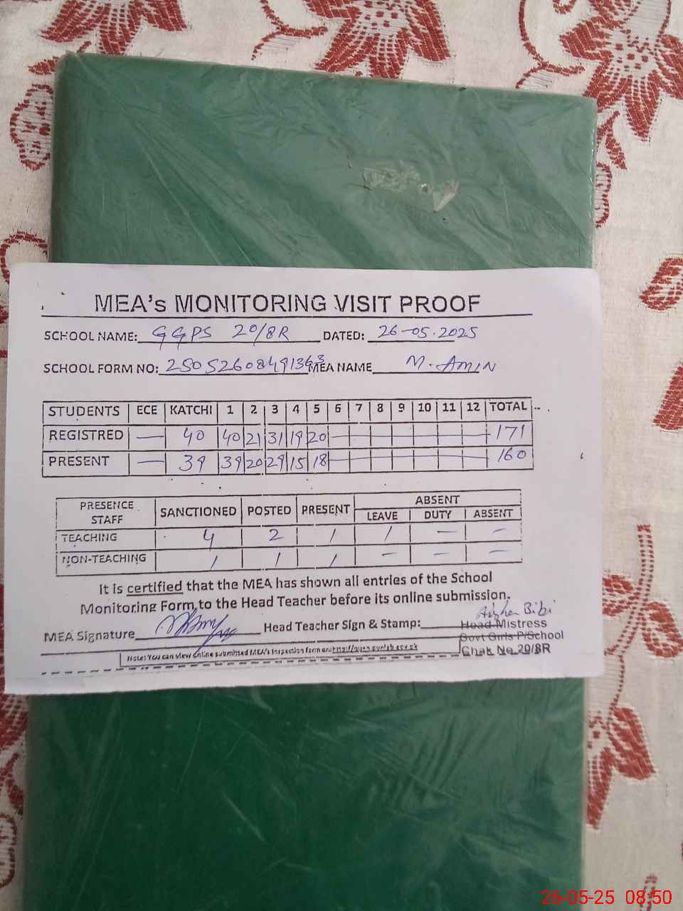 | Attendance Register | Head Teacher | MEA with School | Visit Proof |