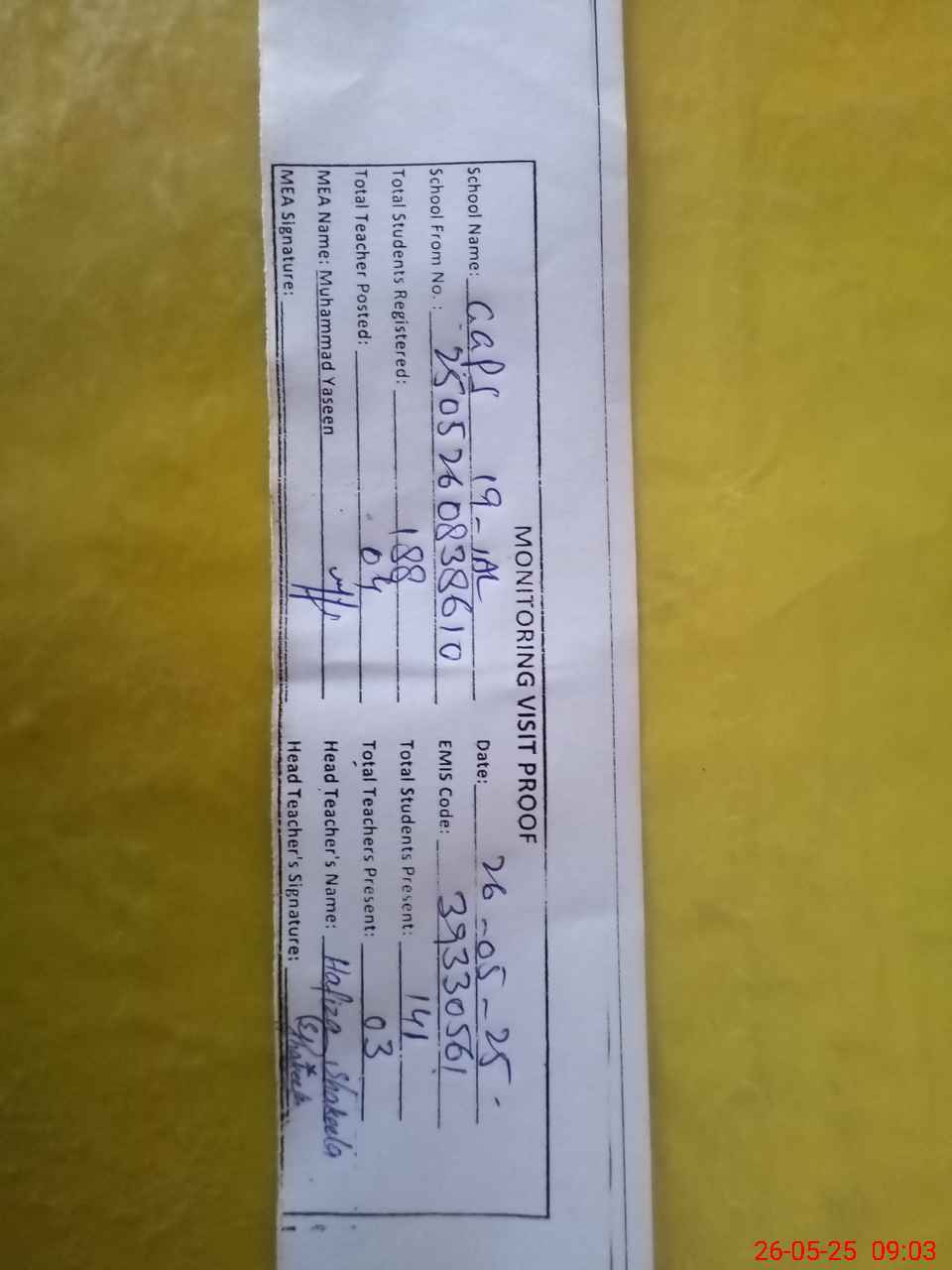 | Attendance Register | Head Teacher | MEA with School | Visit Proof |