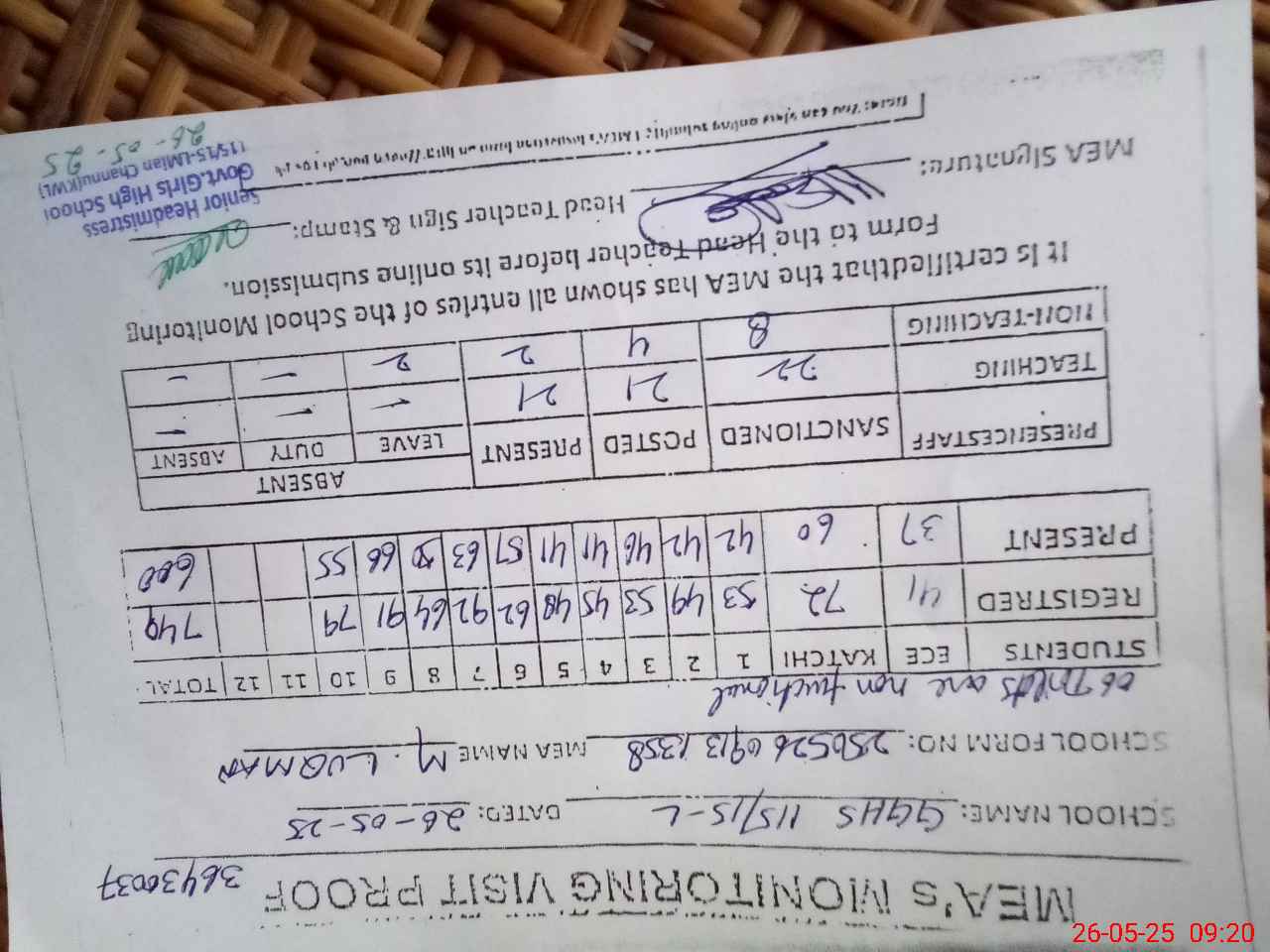 | Attendance Register | Head Teacher | MEA with School | Visit Proof |
