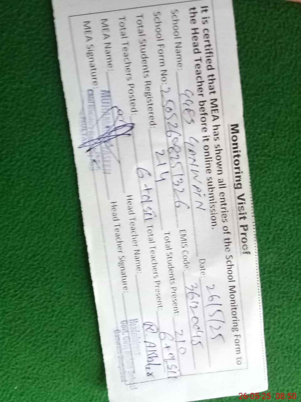 | Monitoring Date: 26-05-2025 | Start Time: 26-05-2025 08:25 AM | End Time: 26-05-2025 08:50 AM | Name of MEA: MU**** YA**** | |