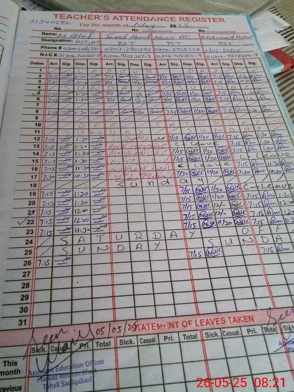 | CNIC | Full Name | Designation | R/C | Absence During Last Calender Month |