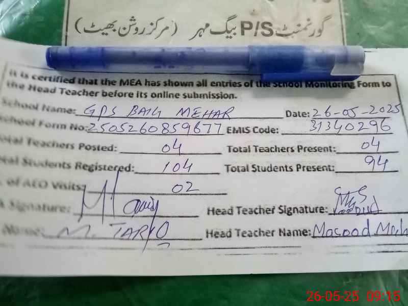 | EMIS Code: 31340296 | Name of School: GPS BAIG MEHAR | |||