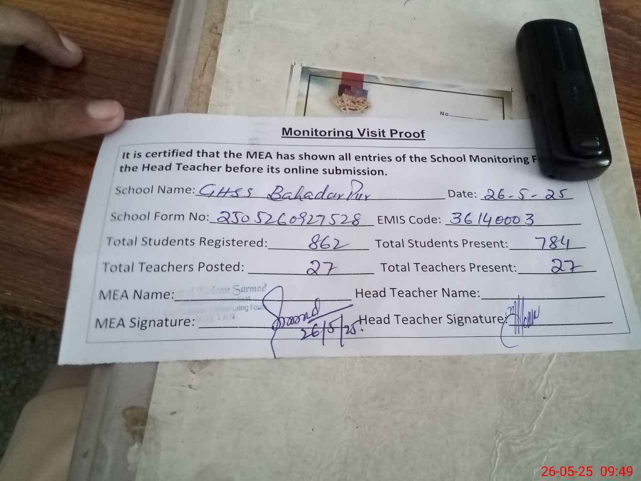 | Attendance Register | Head Teacher | MEA with School | Visit Proof |
