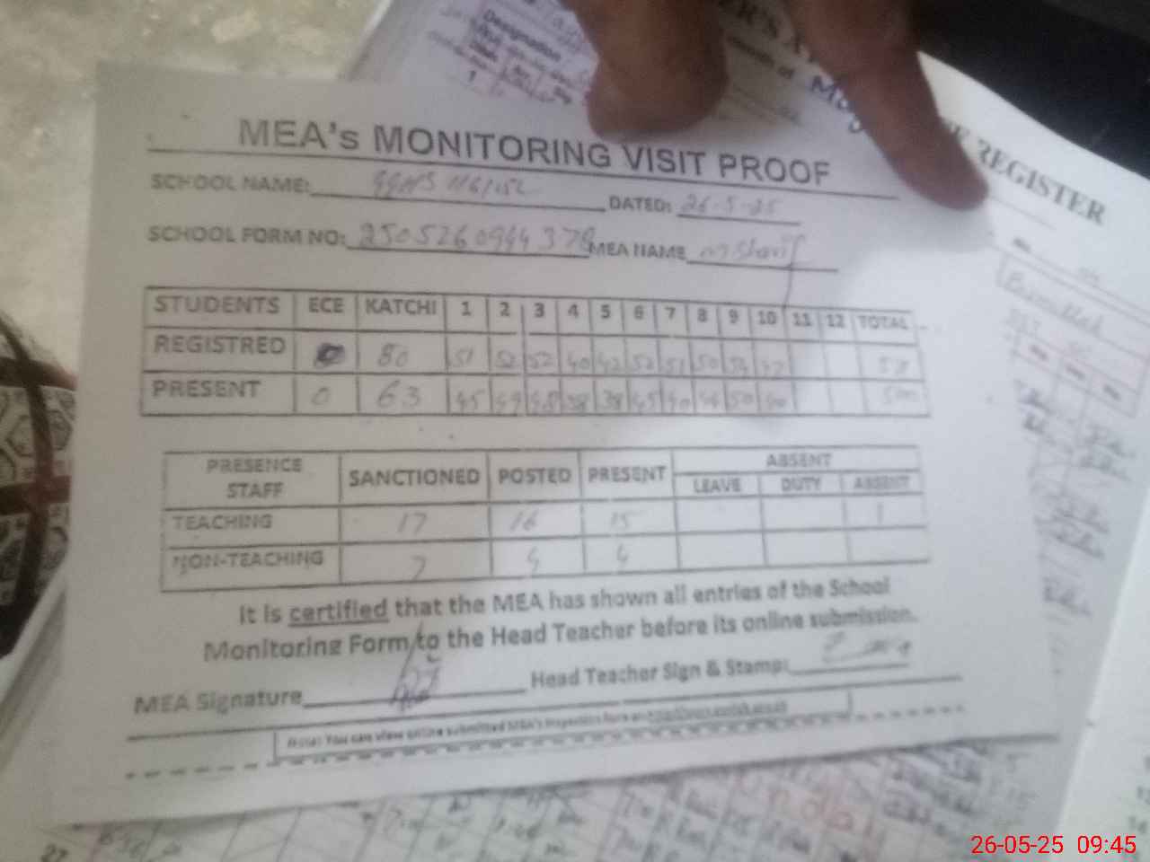 | Attendance Register | Head Teacher | MEA with School | Visit Proof |