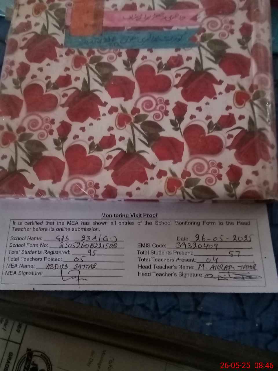 | Attendance Register | Head Teacher | MEA with School | Visit Proof |