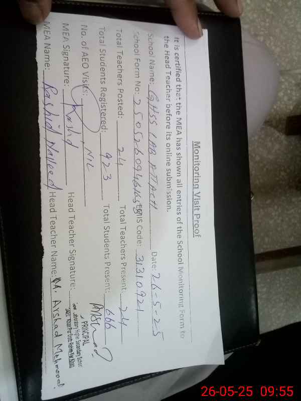 | Certified that this School was Inspected by the Undersigned MEA/DMO Today and the Information Stated Above is as Per Record. | |||||