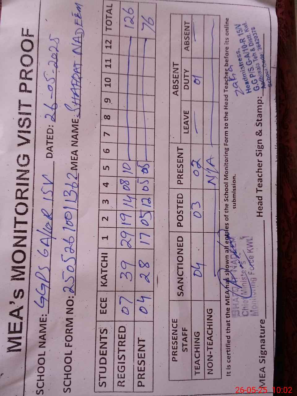 | Attendance Register | Head Teacher | MEA with School | Visit Proof |