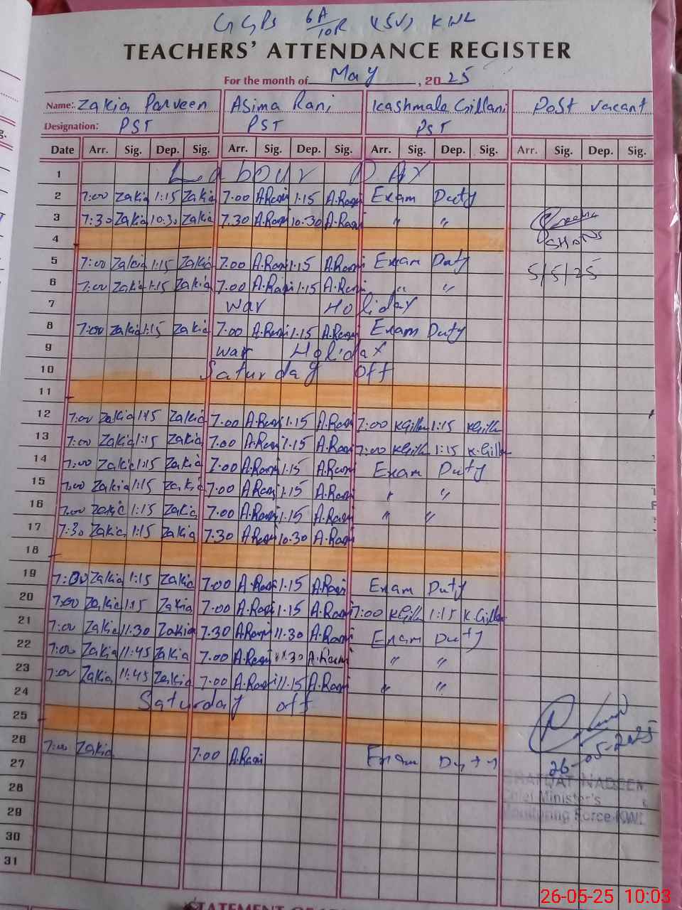 | 36**** | Ka**** Gi**** | 1 | 1 | 0 | 0 | 0 | 0 | 0 | 0 | 0 | 0 | 0 | Exam Duty |