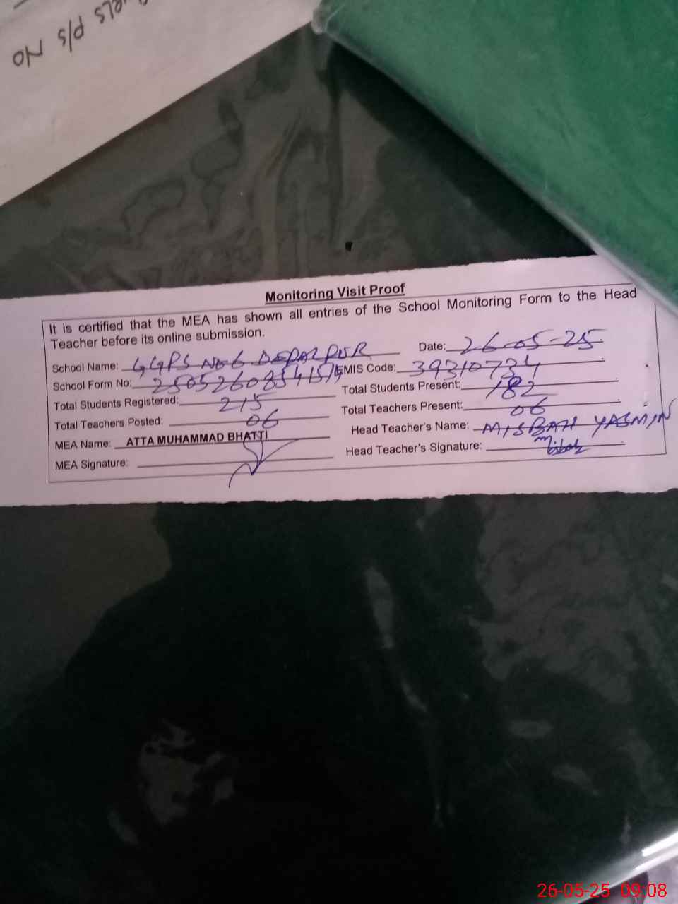 | Attendance Register | Head Teacher | MEA with School | Visit Proof |