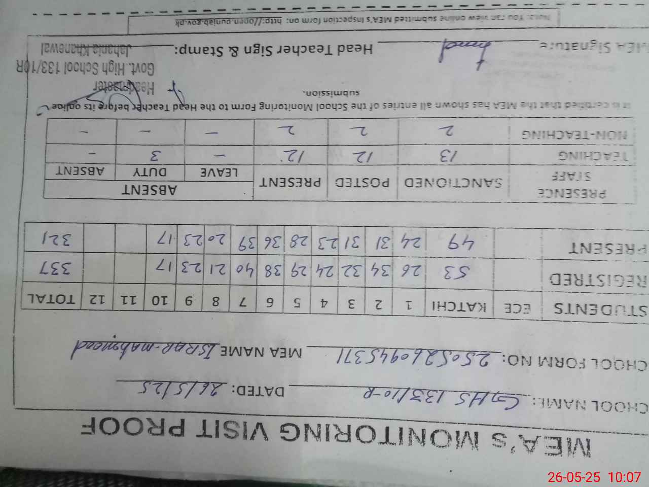 | Attendance Register | Head Teacher | MEA with School | Visit Proof |