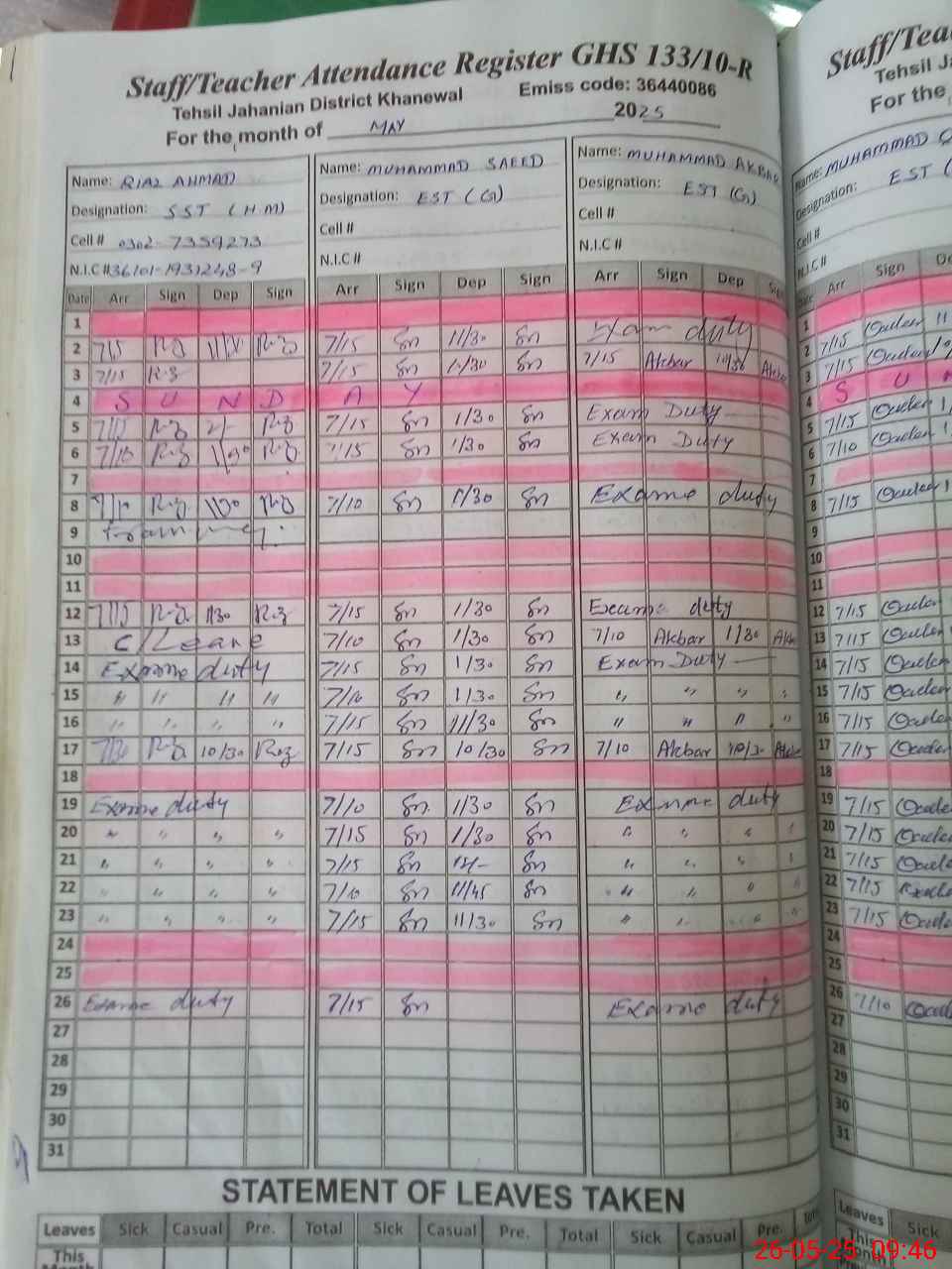 | 36**** | Mu**** Ak**** | 3 | 1 | 0 | 0 | 0 | 0 | 0 | 0 | 0 | 0 | 0 | Exam Duty |