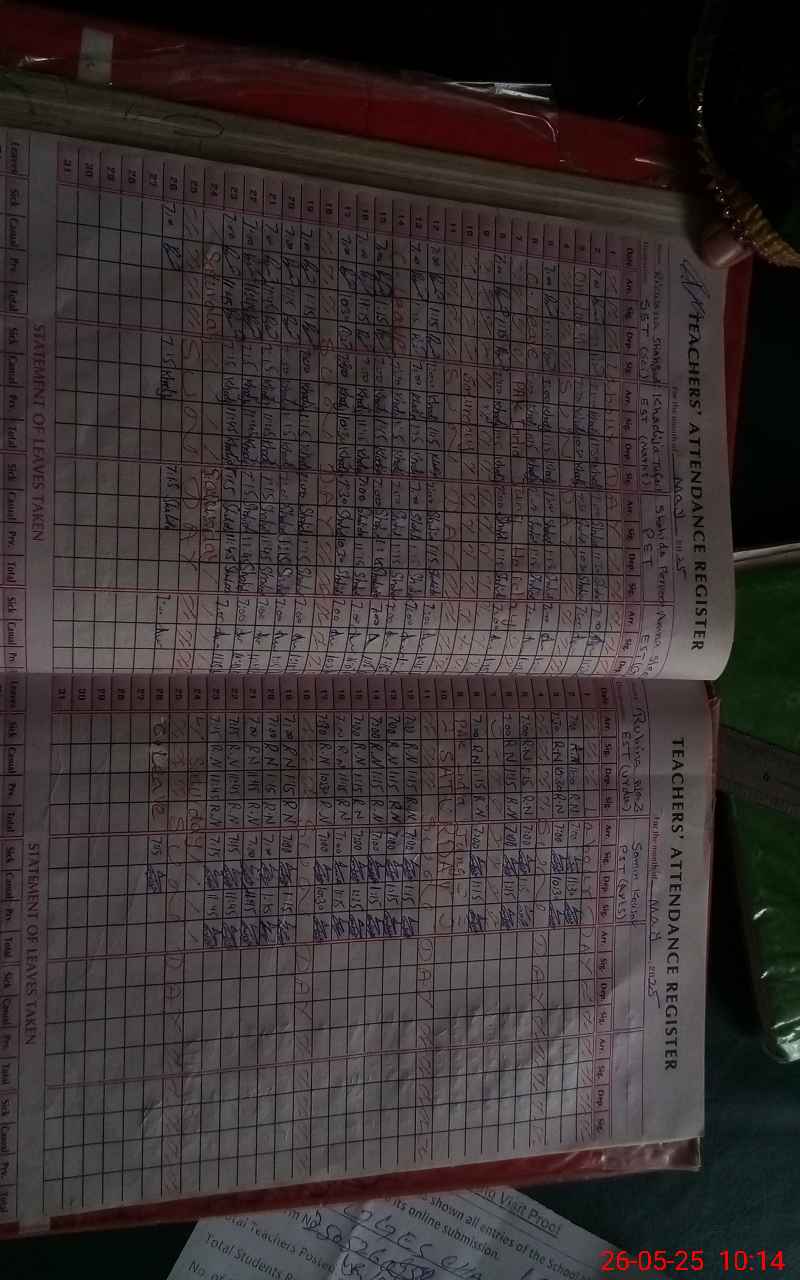| Total no. of Classrooms: 7 No. of Classrooms Used for Teaching: 4 No. of Classrooms Storing Old Furniture, FTBs, etc: 0Comments if Any: Sir teachers and students attendence on sis not carried out 01 class room is partially dangerous |